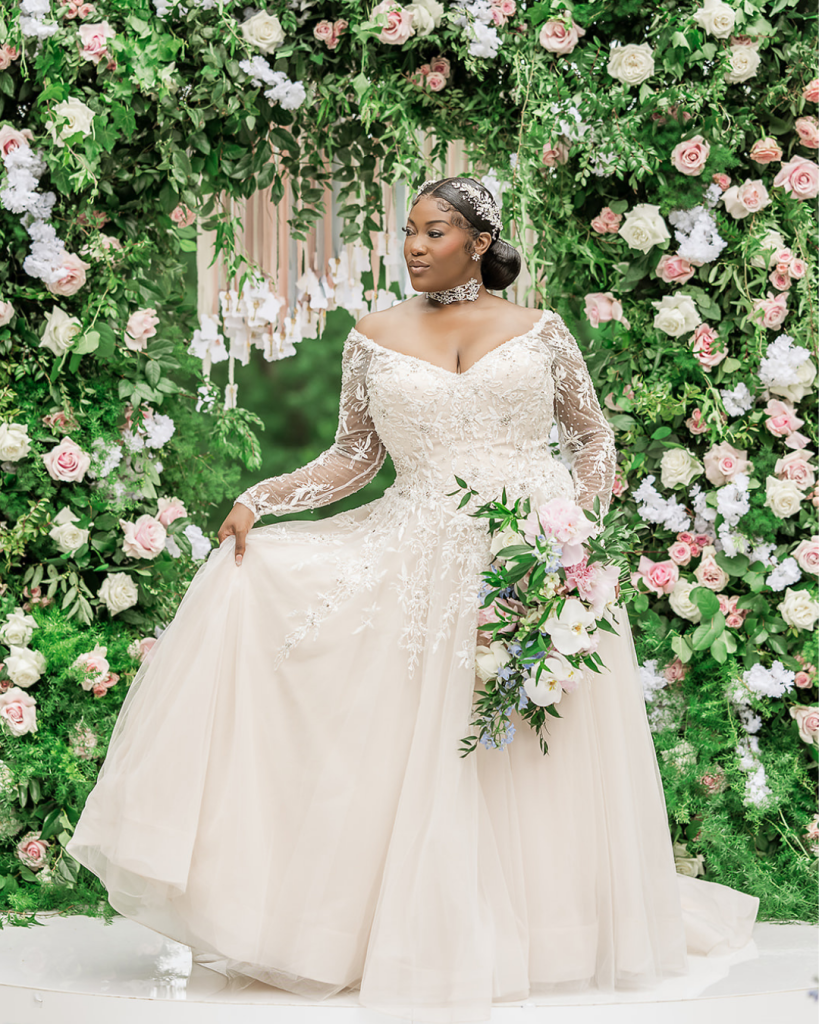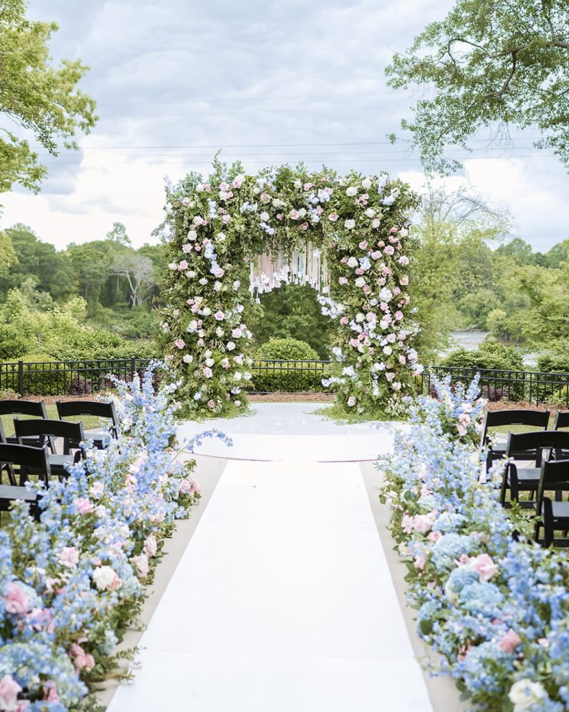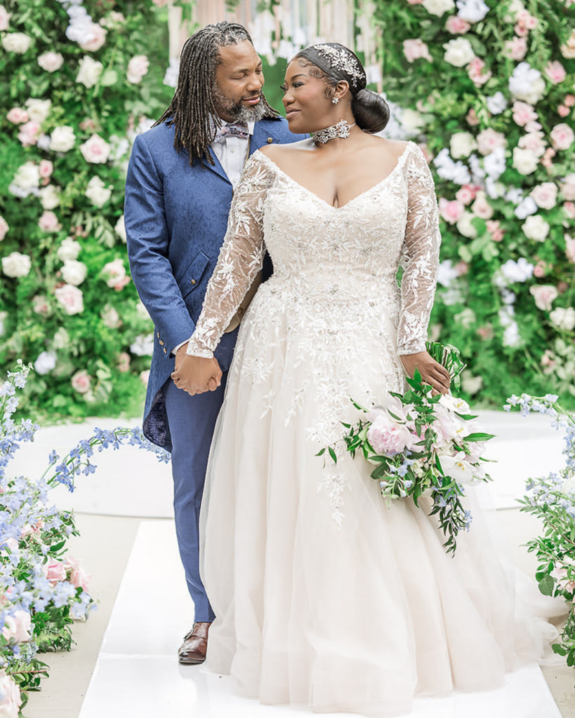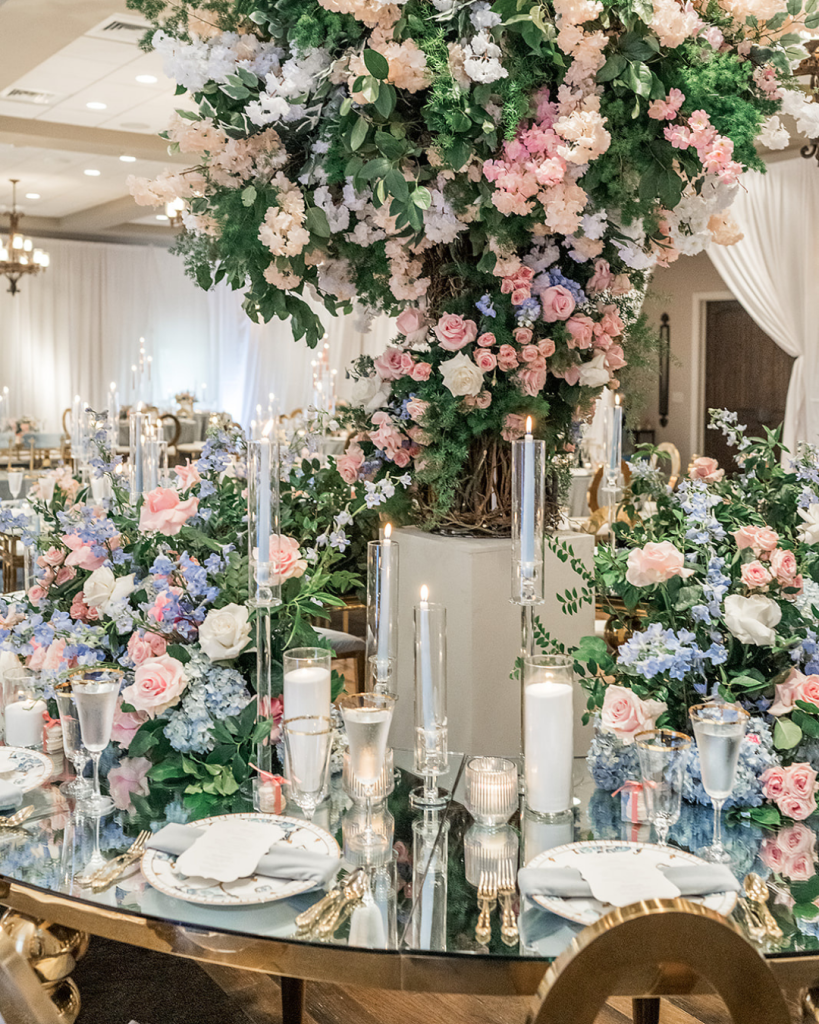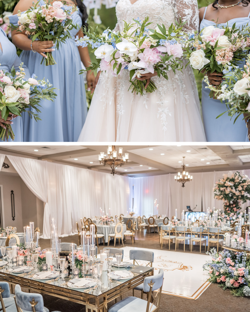 From a musical quartet performing period-inspired pieces to florals by Xpressions Floral + Event Design in soft dusty pink and blue hues, every detail paid homage to the beloved series. Guests sipped signature cocktails named after Bridgerton characters and admired a breathtaking wedding cake surrounded by a floral meadow, adding to the fairytale-like atmosphere.