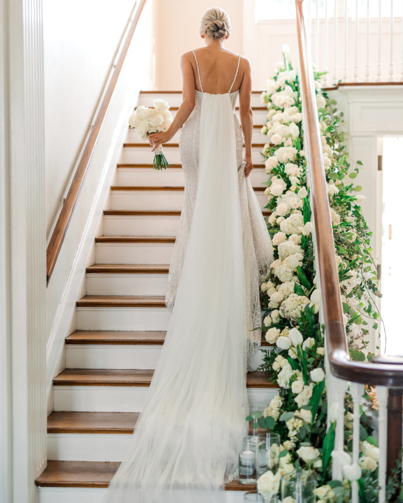 The show-stopping feature of the day? Separk’s iconic staircase — transformed into a floral masterpiece. Lush greenery and cascading white blooms draped across every step, creating a scene straight out of a fairytale.