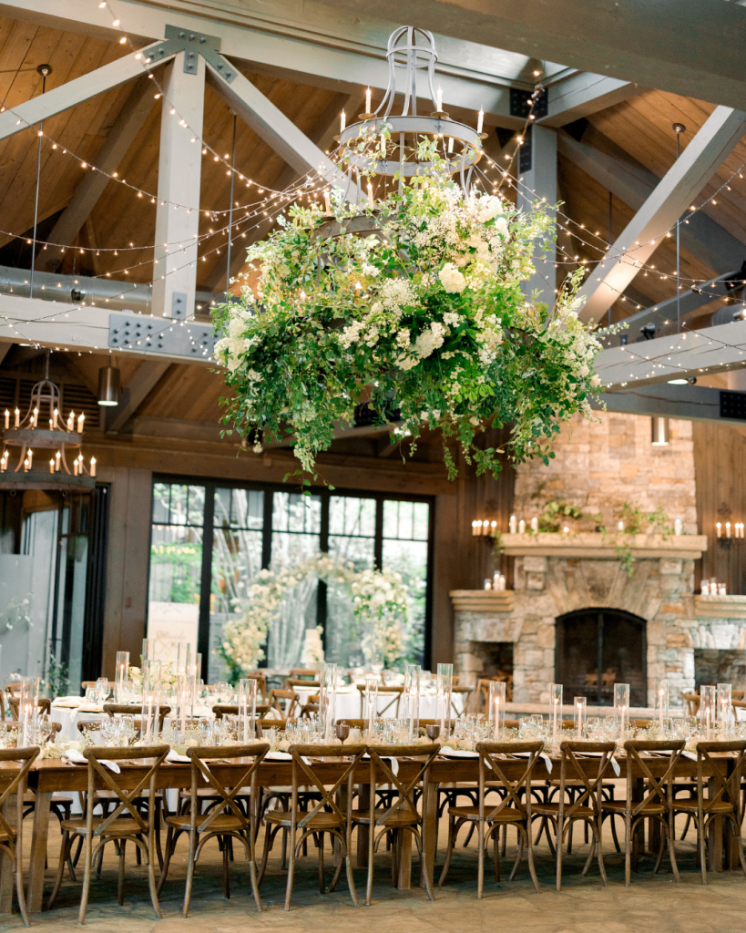 The reception was held in a separate space that offered a cozy contrast to the ceremony’s airy feel. Rich wood accents and a soft, glowing ambiance made guests feel immediately at home. Overhead, string lights intertwined with a stunning floral installation, setting the stage for an evening filled with heartfelt toasts, laughter, and pure celebration — every moment flowing seamlessly thanks to Scout & Grace Events.