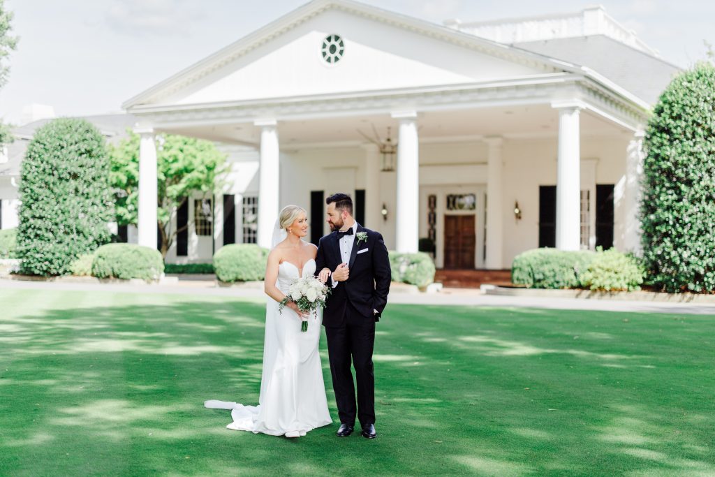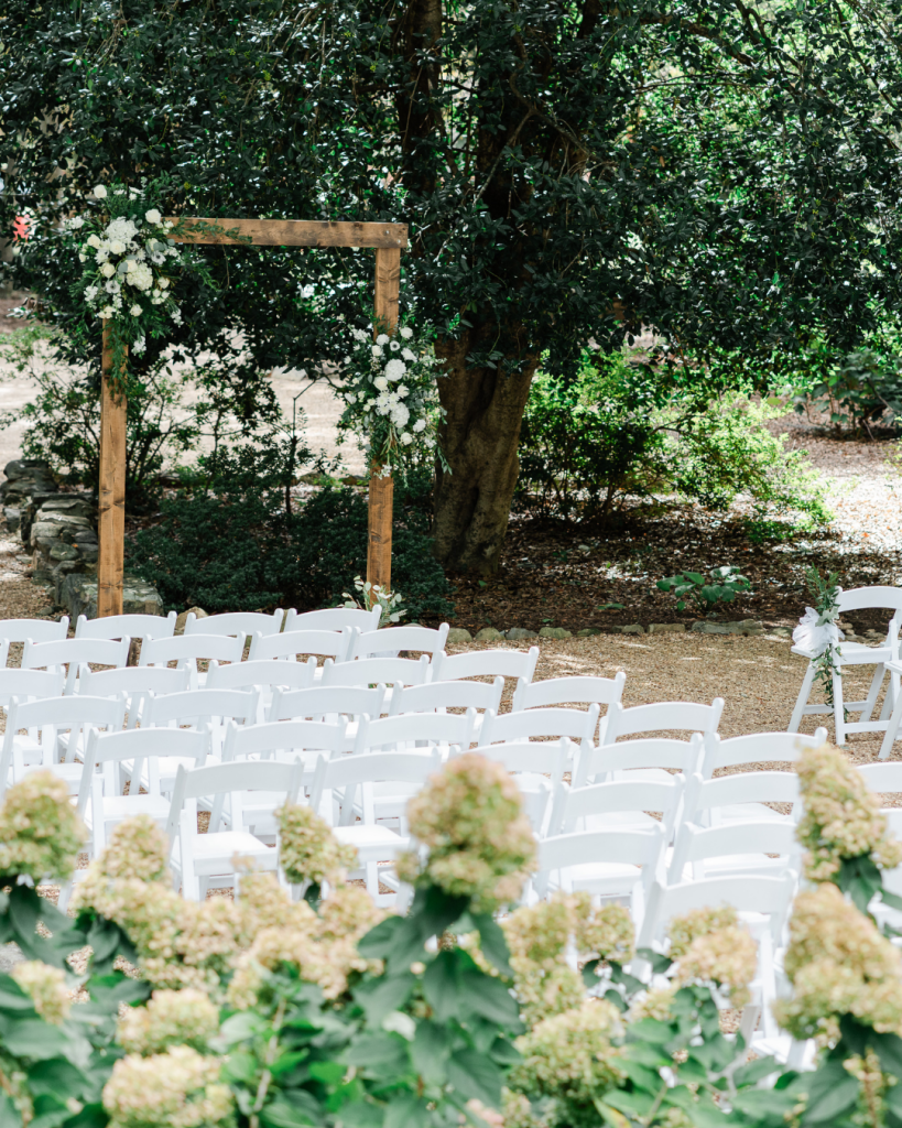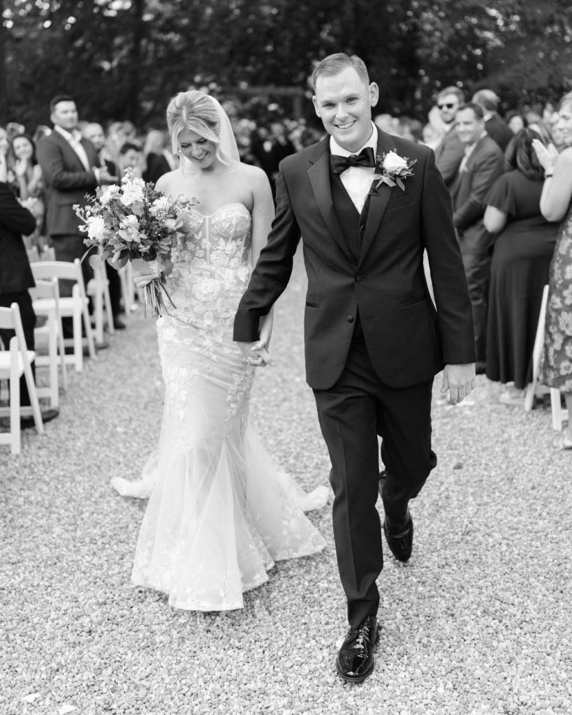 The couple exchanged vows outdoors, surrounded by mature trees and the estate’s historic charm. White ceremony chairs lined the lawn, creating a clean and classic look. The setting was serene and romantic as they began this new chapter together in front of family and friends.