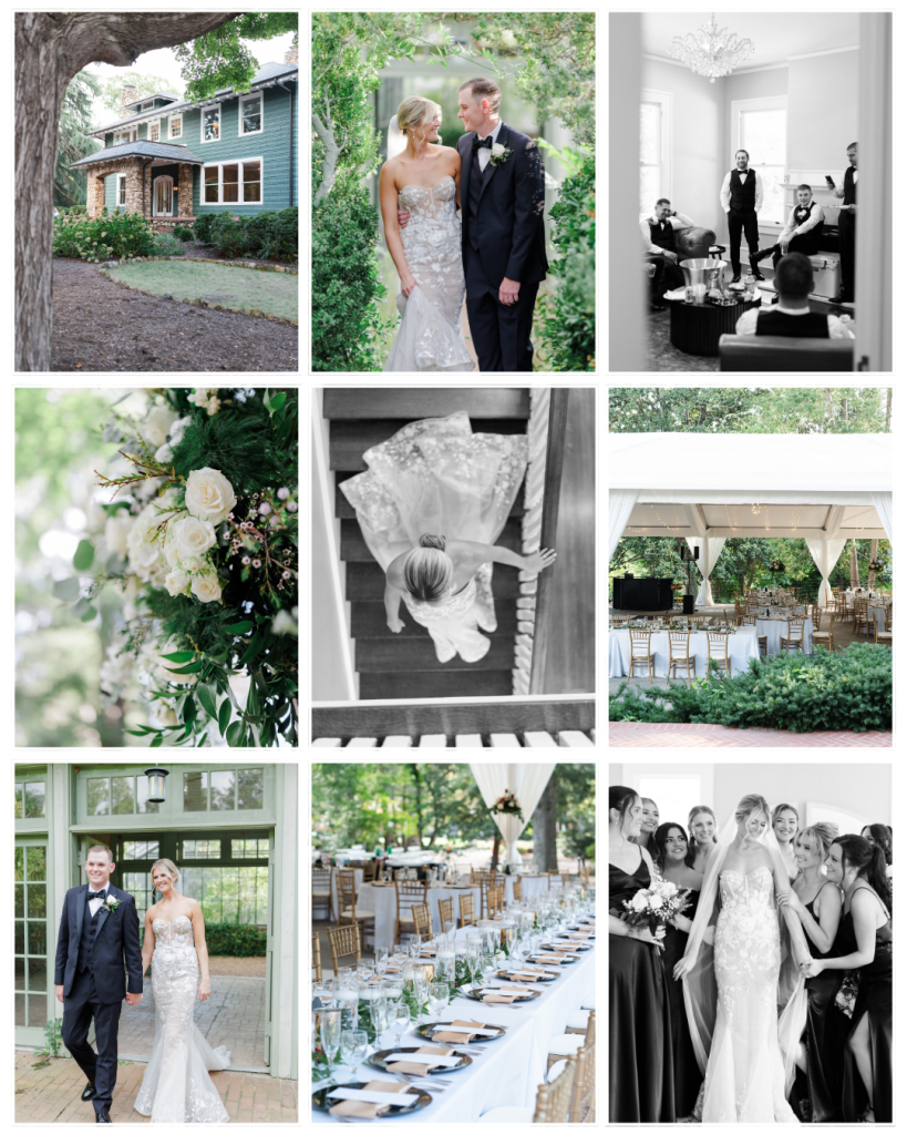 Nestled in Plaza Midwood, The Vanlandingham Estate set the stage for Gabby and Bryan’s timeless Charlotte wedding. Built in 1913 and listed on the National Registry of Historic Places, the estate is known for its classic craftsman architecture, sweeping front porch, wooded grounds, charming greenhouse, and expansive tented patio. It was the perfect setting for their elegant and heartfelt celebration.