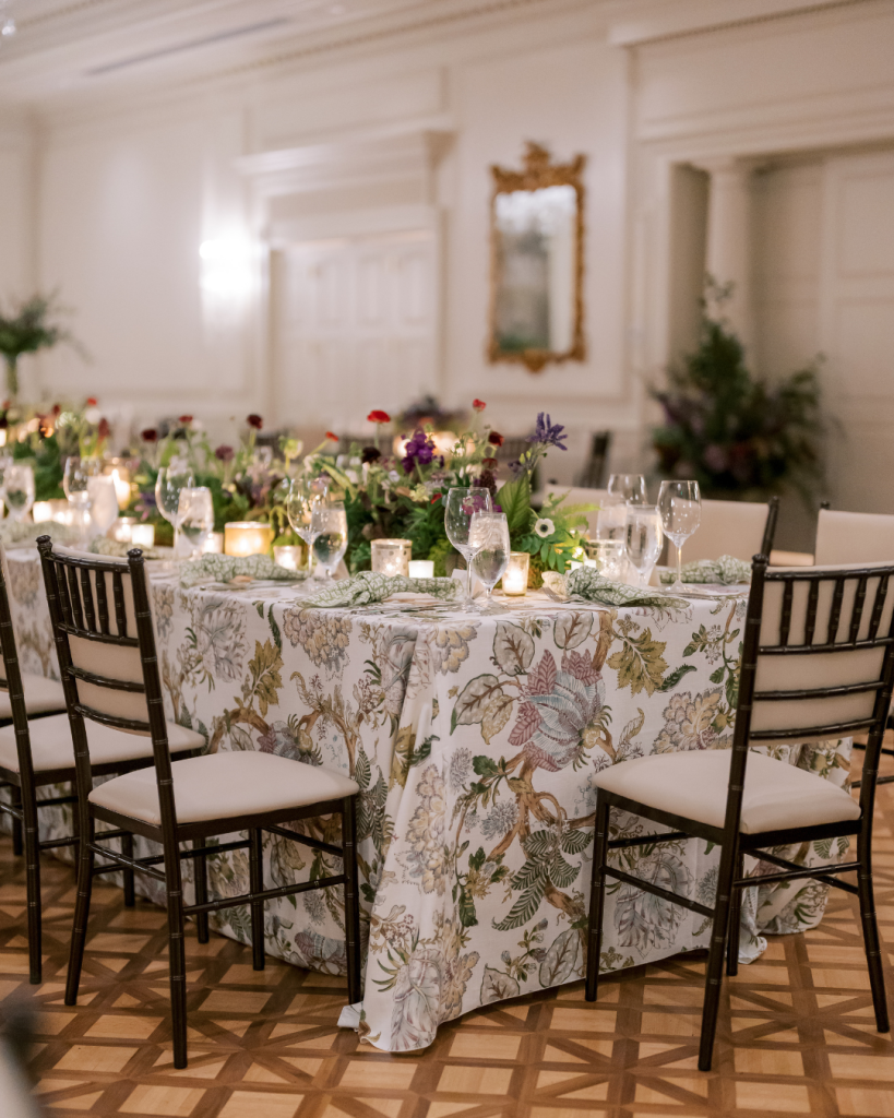 Inside the reception, a long head table overflowing with florals anchored the room and instantly transformed the space into something truly enchanting. Paired with glowing candlelight, the tablescape felt warm, intimate, and inviting, an unforgettable setting for toasts, laughter, and a night of celebration.