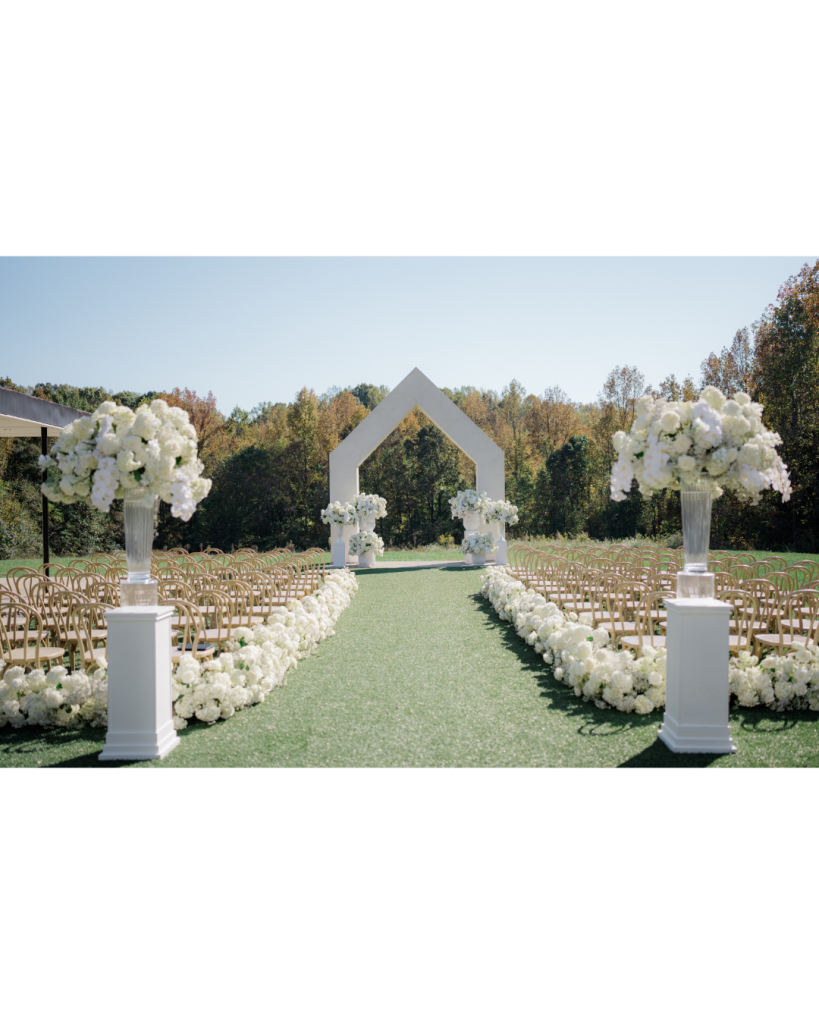 The design vision truly came to life through decor & rentals by Curated Events. Lush white florals lined the aisle, guiding Harmony toward the altar in the most breathtaking way. Above, cascading florals were suspended from stunning crystal chandeliers, creating a floating garden effect that felt straight out of a fairytale.