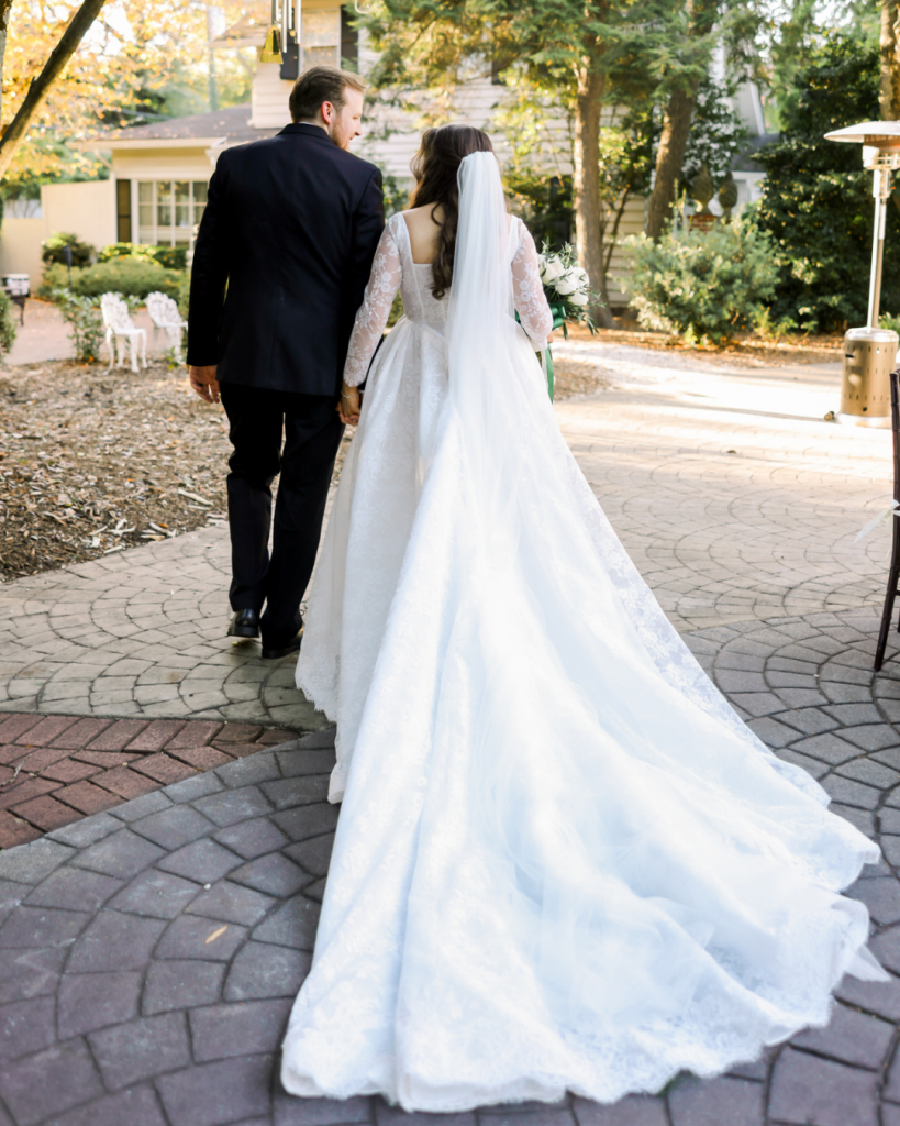 Before stepping into her gown, Vivian shared a quiet moment alone in the main living area, taking solo portraits with her dress, an intentional pause that allowed her to soak in the beauty of every detail before the celebration unfolded. Her gown was nothing short of breathtaking, with lace covering every inch from sleeves to train, a structured bodice, and a square neckline that gave the look a timeless, refined feel.