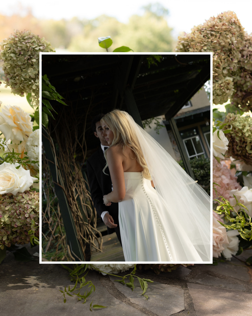 Their ceremony took place tucked away in the woods, where towering trees opened just enough to reveal a quiet pond beyond the couple as they exchanged vows. A half circle floral installation framed the moment, creating a rounded, intimate setting that felt romantic and organic, as though it had always been part of the space. With nature surrounding them and loved ones gathered close, the ceremony was warm, personal, and undeniably timeless.