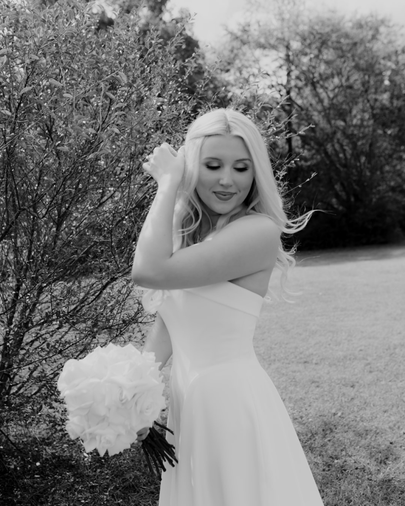Beth’s bridal style mirrored the design aesthetic perfectly. For the ceremony, she wore a sleek, sleeveless gown with a clean silhouette that felt effortlessly elevated. Simple, confident, and timeless. Later in the evening, she changed into a second dress, signaling the transition into celebration mode while maintaining the cohesive feel of the day.