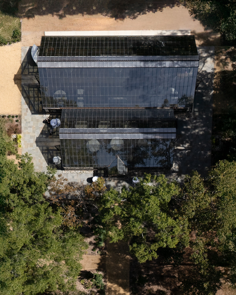 The overall design leaned into an Italian countryside aesthetic through a modern lens, blending European textures with clean lines and thoughtful restraint. The reception was held inside Morning Glory Farm’s newest greenhouse building, a space that instantly set the tone. Glass ceilings allowed light to pour in as the evening unfolded, while dramatic chandeliers hovered above tables dressed in crisp white linens. Stone walls wrapped the lower half of the room, grounding the space and adding depth that made the setting feel both elevated and inviting.