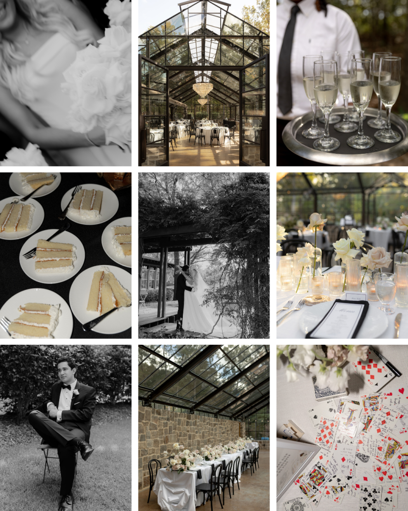 Beth and Justin’s black and white color palette anchored the design, while soft pops of blush in the floral arrangements added warmth and romance. Black chairs and napkins brought contrast and structure, complemented by modern black typography throughout the stationery. White linens and paper goods kept the look classic and timeless, while the place settings felt refined and editorial with white menus featuring black text paired with matching place cards. Every element worked together cohesively, creating a look that was modern yet enduring.