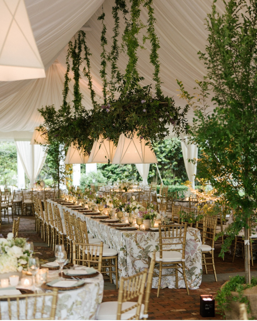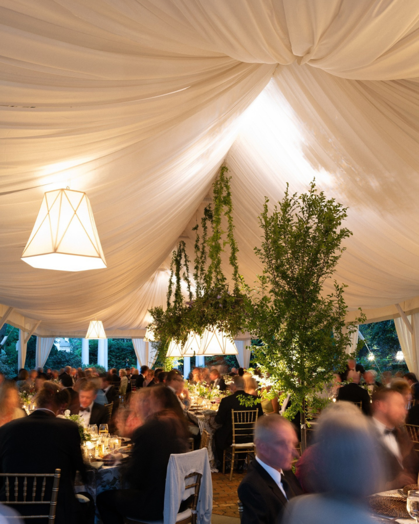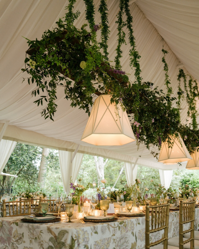 Following the ceremony, guests were welcomed into a beautifully draped tent for the reception. The design struck a perfect balance between romantic and modern, transforming the space into a secret garden dream. Greenery was suspended from the light fixtures, creating an enchanting overhead moment that felt lush and immersive without overwhelming the clean, refined aesthetic.