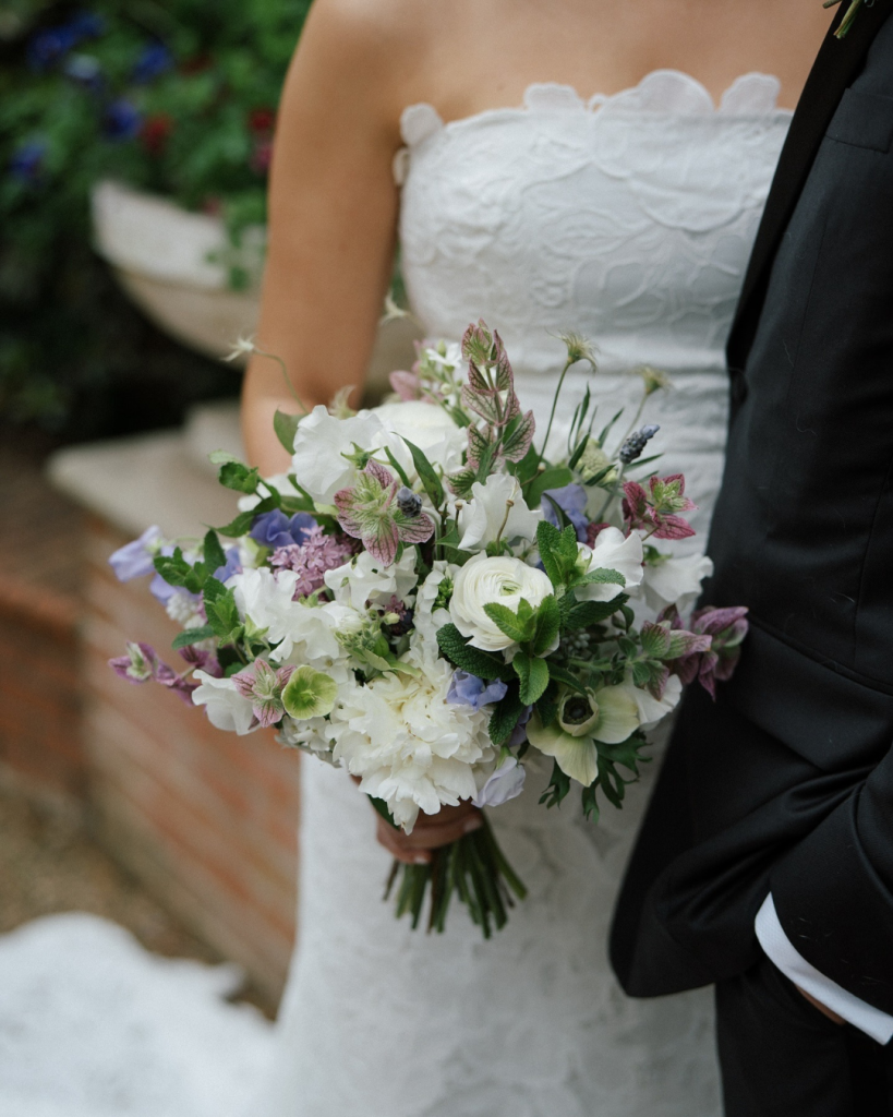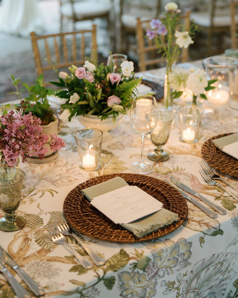Tables were layered with rich textures and soft candlelight, setting a warm and inviting tone as the sun set. Purple and white florals were thoughtfully arranged across the tables, adding depth and color while maintaining an elegant, cohesive palette. The floral design by Proper Flower tied everything together seamlessly, feeling organic, romantic, and timeless.