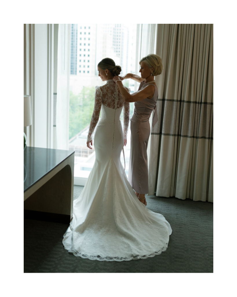 Getting ready moment with bride Cathy sitting in soft lighting as her dress is adjusted