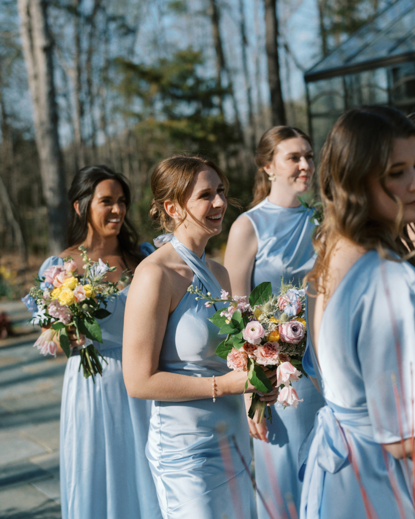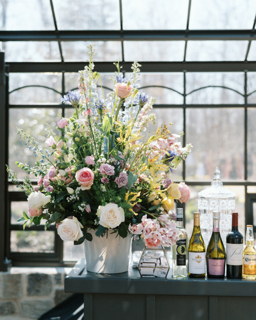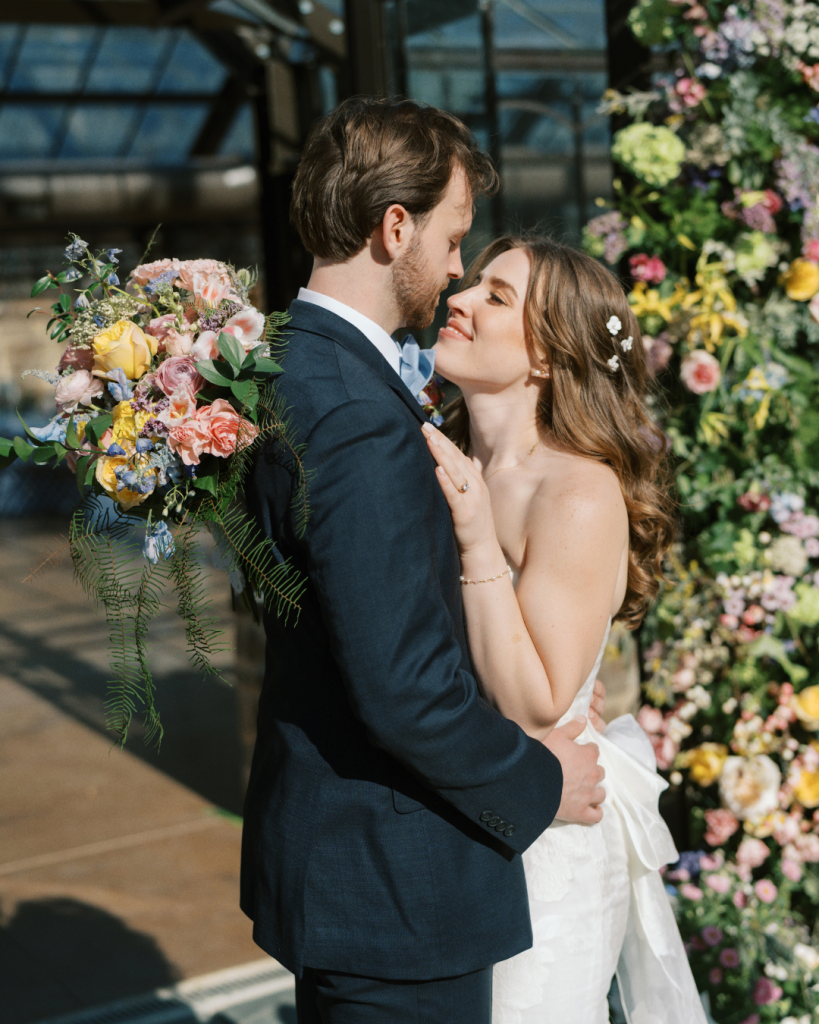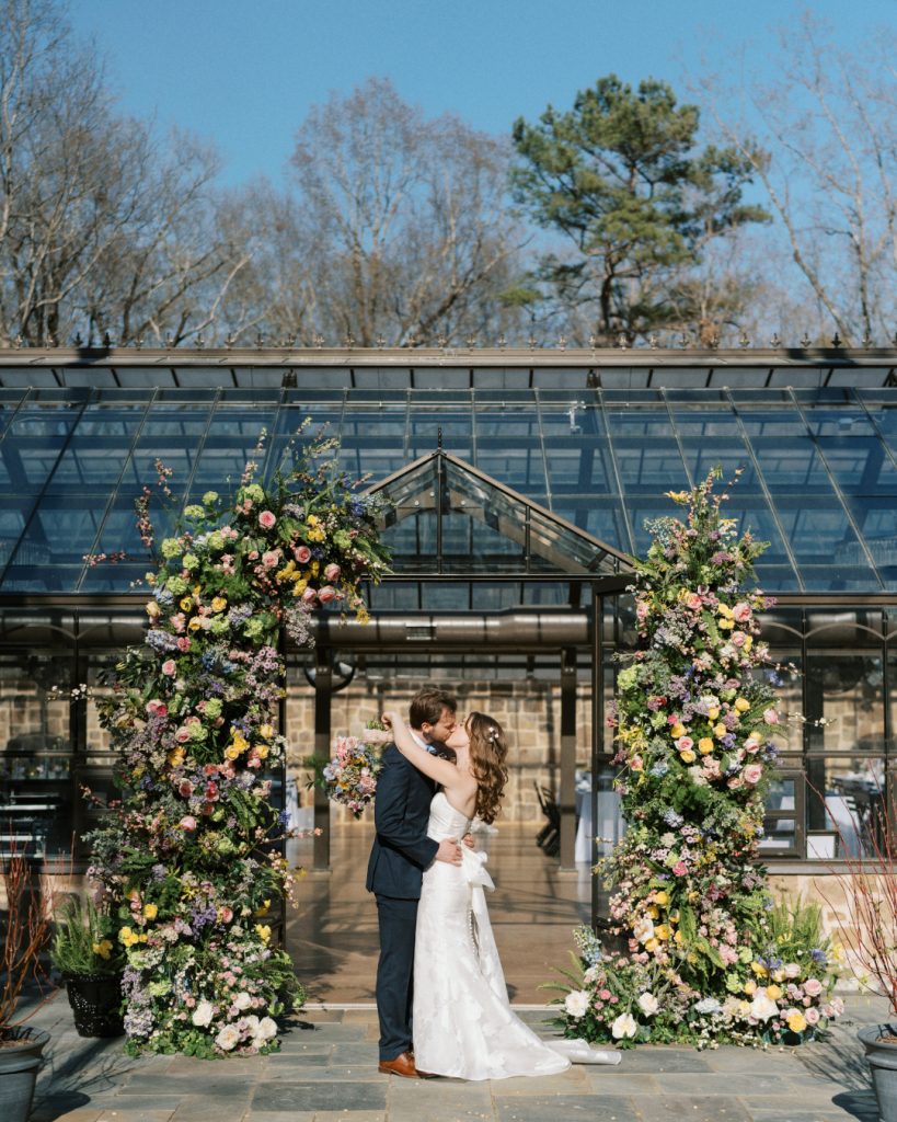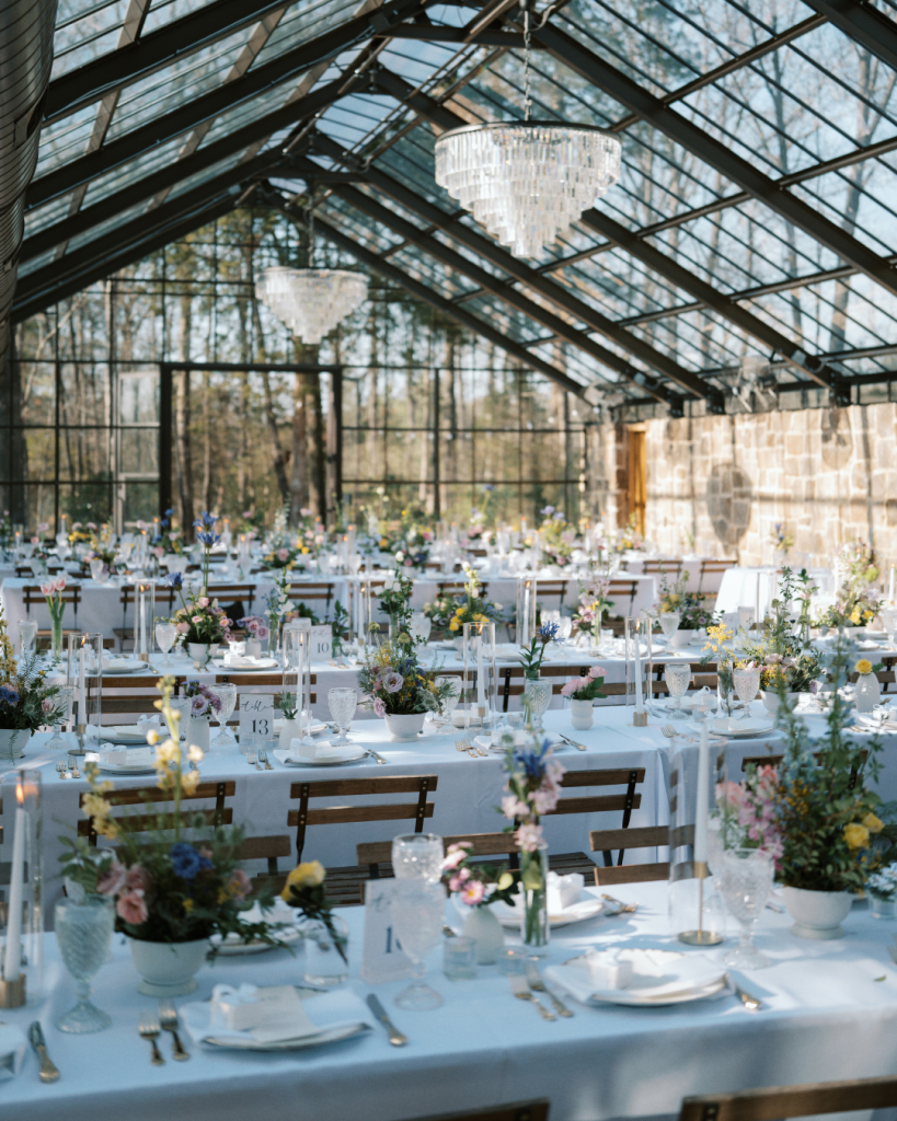 The floral artistry by Kevin Lear On Main brought the couple’s vision to life with soft pastel shades of pink, blue, green, and yellow. The reception dinner, held inside a stunning greenhouse adorned with crystal chandeliers, created a romantic and enchanting atmosphere for guests to enjoy.